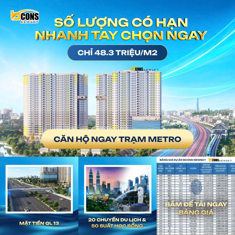 Hãy hành động ngay lập tức để không bỏ lỡ mức giá 48.3 triệu/m2 cùng tấm vé du lịch quốc tế và học bổng mầm non toàn phần tại bcons new sky. Liên hệ ngay để nhận báo giá chi tiết và hỗ trợ chọn căn đẹp nhất phân khúc căn hộ thuận an bình dương.